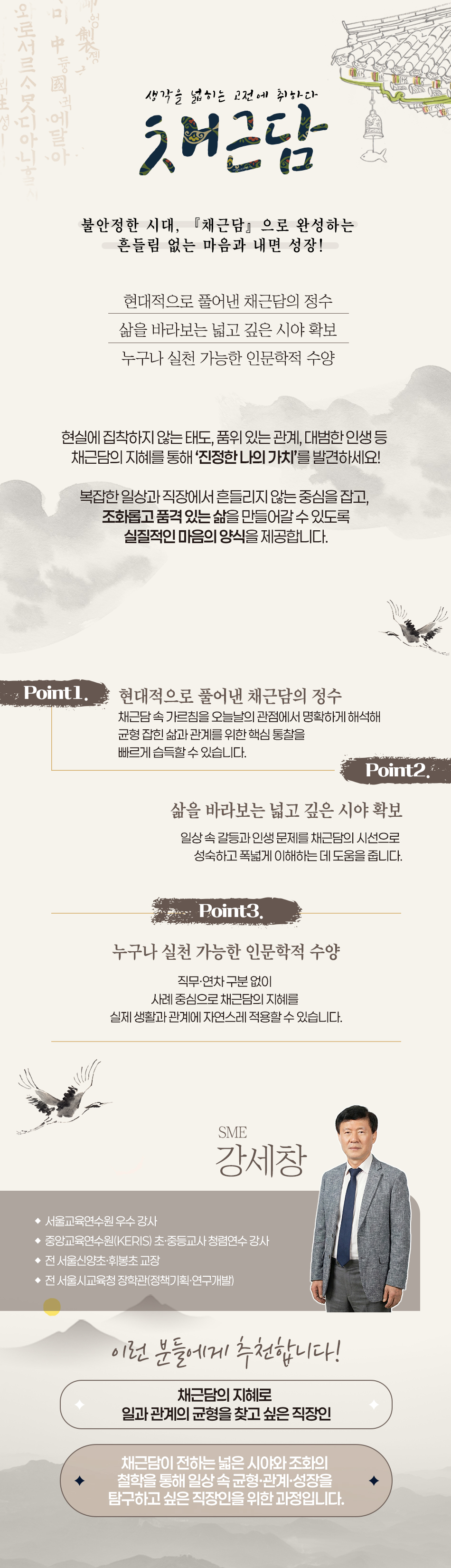 본 과정은 채근담의 핵심 사상을 6개의 주제로 체계화하여, 번잡한 일상에서 벗어나 여유롭고 지혜로운 삶을 살아가는 방법을 제시합니다. 욕심을 내려놓고 마음의 평화를 찾으며, 진정한 인간다움을 실현하는 삶의 철학을 함께 탐구해보시기 바랍니다.
