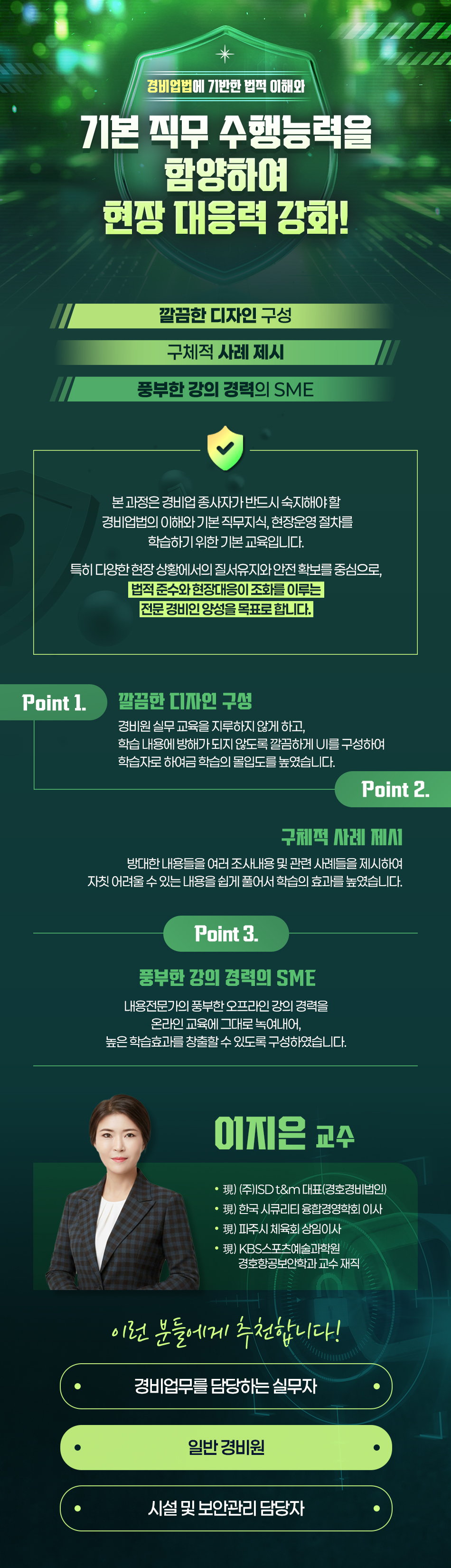 특히 다양한 현장 상황에서의 질서유지와 안전 확보를 중심으로, 법적 준수와 현장대응이 조화를 이루는 전문 경비인 양성을 목표로 합니다.