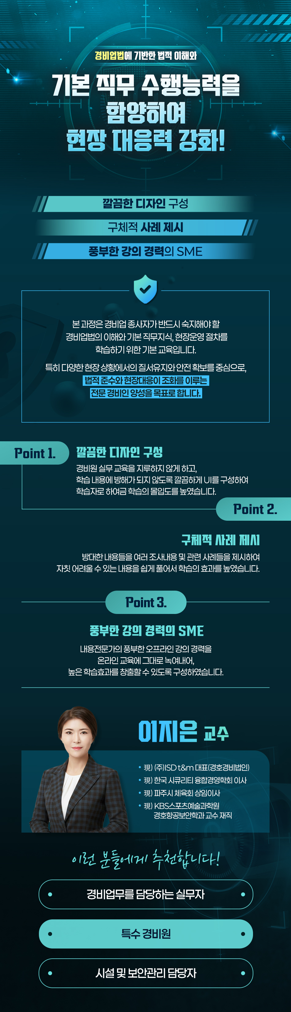특히 다양한 현장 상황에서의 질서유지와 안전 확보를 중심으로, 법적 준수와 현장대응이 조화를 이루는 전문 경비인 양성을 목표로 합니다.