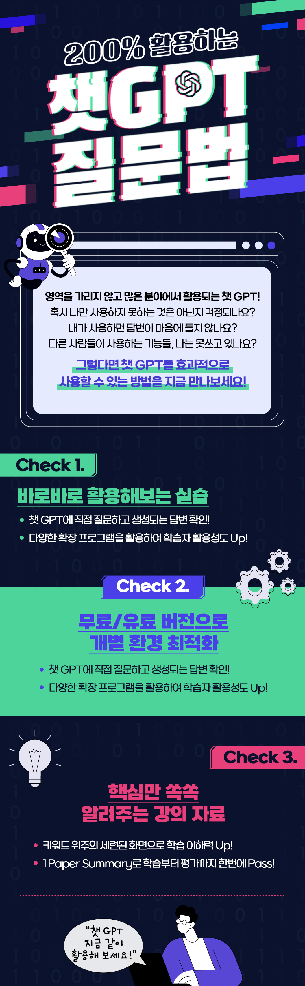 학습개요<200% 활용하는 챗 GPT 질문법>은 ‘챗 GPT에게 어떻게 질문해야 원하는 답을 얻을 수 있는가?’에 초점을 맞춘 실습형 콘텐츠입니다.