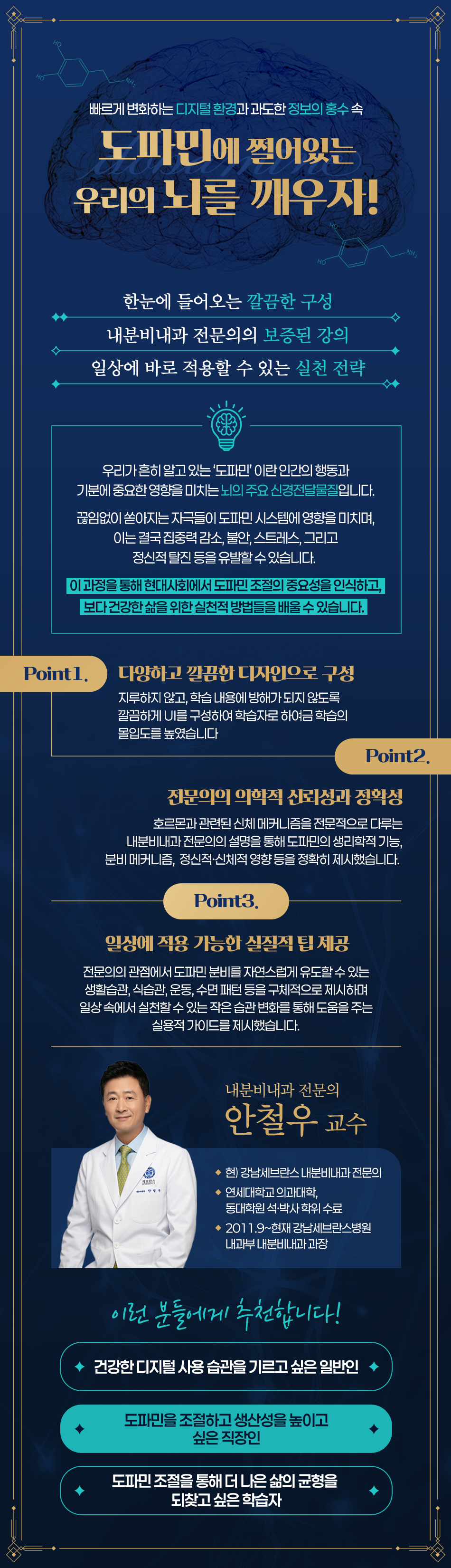 빠르게 변화하는 디지털 환경과 과도한 정보의 홍수 속에서 도파민이란 무엇인지 어떻게 관리해야 하는지 알려주는 과정입니다.